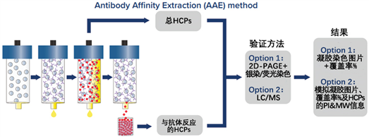 AAE分析流程首先將多克隆抗體共價固定在色譜柱上。然后對色譜柱進行條件調節(jié),以防止抗體的顯著浸出并極大地減少任何非特異性結合。原始未變性的HCPs樣品通過色譜柱與抗體進行結合,隨后用酸洗脫。通過結合和洗脫,HCPs樣品再次在柱上循環(huán),直到?jīng)]有其他HCPs被結合。所有收集的HCPs洗脫液再匯集、交換緩沖液并濃縮回原始樣品體積,為后續(xù)的分析提供高質量的樣本。在收集到HCPs樣本后,可以選擇通過2D-PAGE+銀染或MS質譜進行后續(xù)分析。
